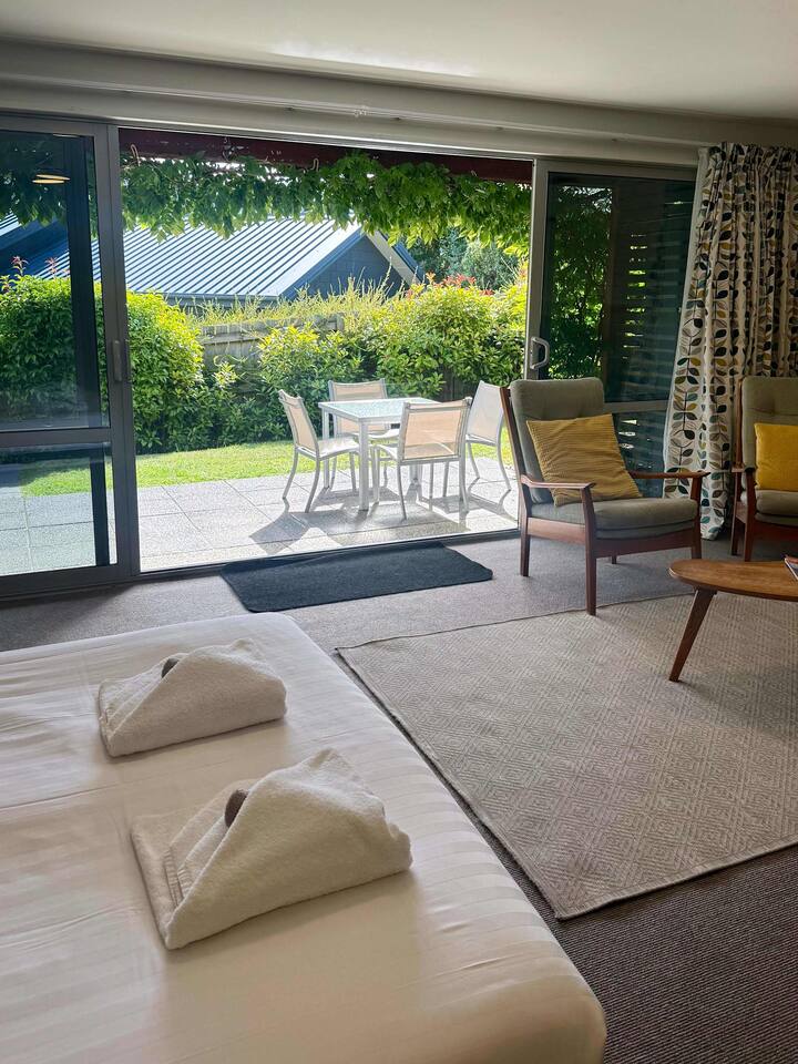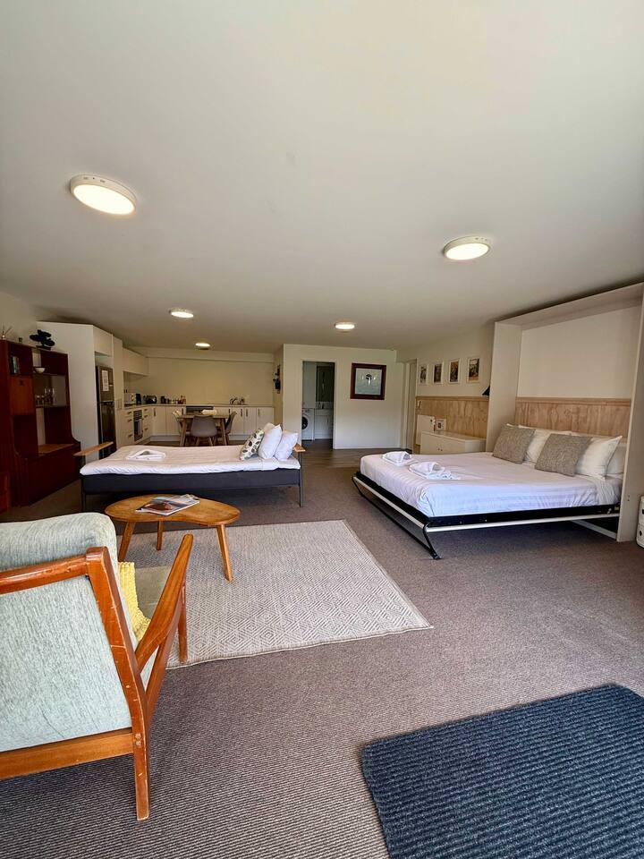 Located right on the edge of the popular Mount Iron trail, this retro-styled studio is an ideal spot for couples. The studio is spacious with a modern kitchen area and bathroom. The main bed folds up into the wall giving you even more space and the couch is a sofa-bed - ideal for little ones. The retro styling of this pad is super inviting and the living area is just perfect of intimate chats as the sun goes down. **Please note, stays 6 nights or longer require additional linen charge**